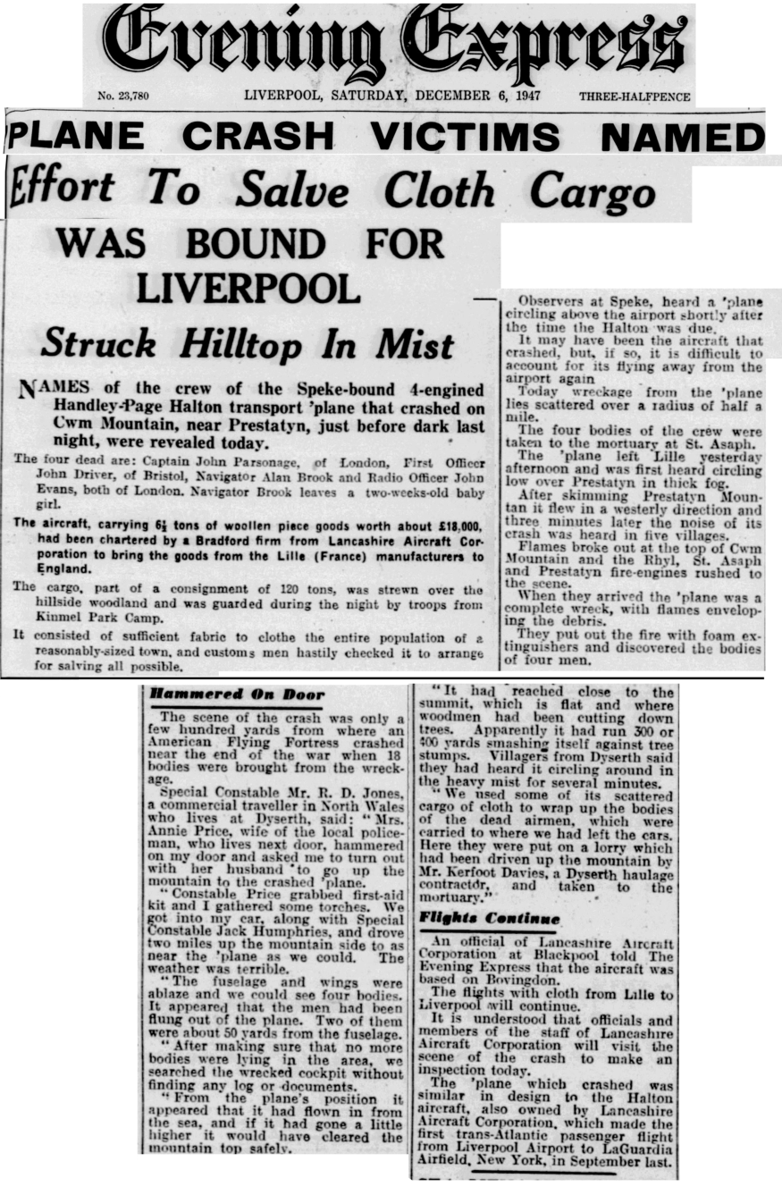The crash site was given as:Summit of Cwm Mountain, St Asaph, North Wales. 21.75 miles west of Speke Airport.A marker on the map shows the rough position.