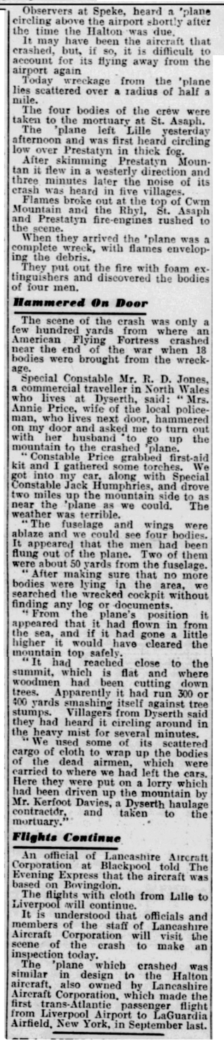 The crash site was given as:Summit of Cwm Mountain, St Asaph, North Wales. 21.75 miles west of Speke Airport.A marker on the map shows the rough position.
