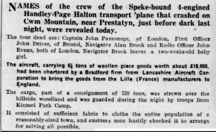 The Crew - extracts from the accident reportThe CaptainMr John H. Parsonage joined the R.A.F. On 12th April 1938 and was awarded his pilot’s flying badge on 31st July 1942. His R.A.F. Duties included operational flights in Halifax aircraft.He was released from the R.A.F. on 26th January 1947 upon the completion of his service.He passed a general flying test on 2nd July 1947 and was granted a Class ‘B’ pilot’s license on 3rd September 1947 and was subsequently endorsed for Haltons. He had completed approximately 2,000 flying hours, of which 1,025 hours were in Halifaxes. His night flying hours totalled 580.According to his service logbook he had carried out 56 hours of instrument flying of which 20 hours were as 1st pilot. Link trainer instruction was stated to be 49 hours.The records of the operating company show that this officer had operated 120 hours as 1st pilot since engagement.First OfficerMr John Driver applied for his ‘B’ License on 30th September 1946 and then stated that he had completed 552 hours flying as 1st pilot during his service in the R.A.F.V.R. His ‘B’ license, No. 24161 was granted on 11th January 1947 and was endorsed for Haltons. It was valid at the time of the accident. The operating company state that he had completed 175 hours flying in this type.On this flight he also undertook the duties of Flight Engineer.Navigating OfficerMr Allan Brook stated that his navigational experience in the R.A.F. Amounted to 843 hours by day and 263 by night, of which 750 hours were on trans-atlantic ferry duty using astro and radio aids only.He was issued with a modified 1st Class Navigator’s license No. 2319 on 28th July 1947.Radio OfficerMr John E. Evans applied for a Radiotelegraphy License on 26th February 1947. He then stated that he had carried out 5.5 years service in the R.A.F. and Transport Command and had 1650 hours flying experience. A provisional Certificate of Proficiency No.1386 was granted on 17th April 1947 after an examination. According to the operating company Mr Evans had flown 181 hours for them as Radio Officer.